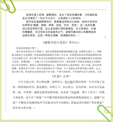 在这次封控中,同学们发挥自己的写作才华,借文字表露了自己的心声,缓解了封控带来的苦闷无聊,抒发了自己坚定抗疫的情怀。