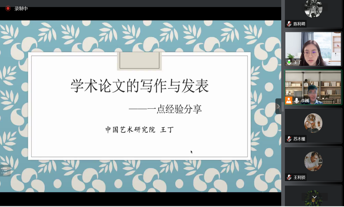 王丁以其博士学位论文《明末清初文士以画治生研究》为例讲解了博士论文写作中的相关问题。关于如何选题,王丁指出可以从自己的研究兴趣入手,在此基础上阅读文献,在阅读文献的过程中以遇到的问题为中心阅读史料,了解既有研究状况,从而理清思路,寻找自己的研究切入点。关于如何找到问题,王丁认为可以从自身感兴趣的问题出发多读材料,再从感兴趣的问题中的个案入手展开整个研究。她认为,在研究过程中要多读该领域的整体研究成果,明晰学科地图,即了解别人在该领域做了哪些工作,解决了哪些问题,还有哪些问题尚待解决。同时,王丁强调要阅读相关的理论原典和研究著作,了解理论方法,在掌握理论的基础上发现问题,利用理论为解决问题提供思路。
