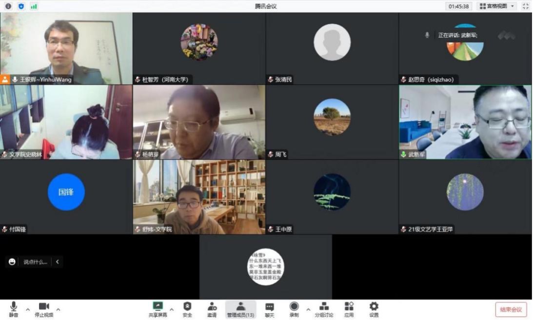 张清民、杜智芳等教研室教师针对在教学工作中遇到的问题,提出自身的疑虑、意见和建议。张清民认为,文艺理论教研室今后要起到积极的模范和带头作用,教研室要加强团队建设,积极申报教研项目,努力提升教学水平;在课程建设方面与国内同行保持互动,学习优秀课程经验,提升学生的主动性及创新性,力争取得高质量教育成果。此外,围绕线上课程平台的使用、非标准化考试实验推行、选修课课程安排及班级规模、户外课程申请程序等问题,教研室教师进行了热烈且富有深度的讨论。
