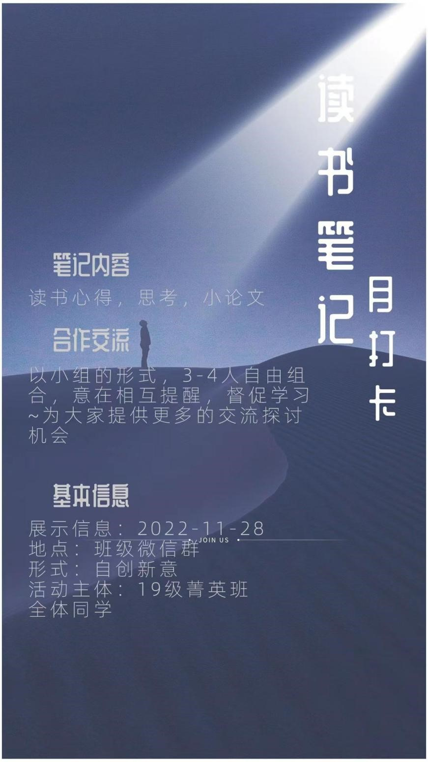活动分为“分享汇报”和“投票评选”两个环节。当日上午,菁英班全体同学在微信读书群提交读书思考成果并展开讨论。下午,经全体同学投票决定,王禹阳、李军娜和刘孟淇的作品被评选为优秀作品。