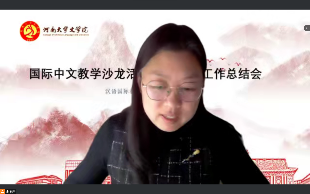 12月16日晚,汉语国际教研室于线上举行了汉语国际教育专业教学沙龙活动。院党委书记杨萌芽,院党委副书记、院长武新军,副院长白金,汉语国际教研室教授辛永芬,副教授戴宁淑、董秀英,教师姚云、王昕、章敏,部分研究生和本科生代表受邀参会。活动由汉语国际教研室主任郭华主持。