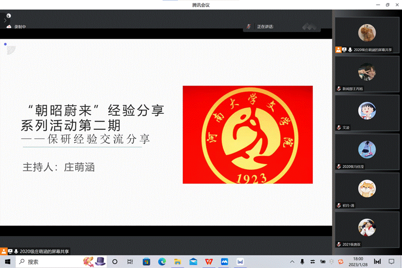 经验分享系列活动第二期——保研经验交流分享活动在28日晚举行,本次活动由2020级汉语言文学专业本科生庄萌涵主持。汉语言文学专业的文凌、杨争、胡巧、王禹阳、张鸣朝,戏剧影视文学专业的谢昊,汉语国际教育专业的郑涵予,硕师计划的卢千炫等2019级本科生围绕“保研目标院校选择”“保研面试加分项”“保研网站与资料推荐”“保研夏令营与预推免的注意事项”等方面为同学们进行讲解,从学术兴趣、职业规划与竞争压力等因素,对保研方向选择进行综合分析;向同学们分享了各自的保研经历;根据各自的专业特性对保研方向选择与面试准备过程提出了具体化建议;简要介绍了硕师计划的基本内容,以自身经历为依据为同学们保研提出了新的可能。