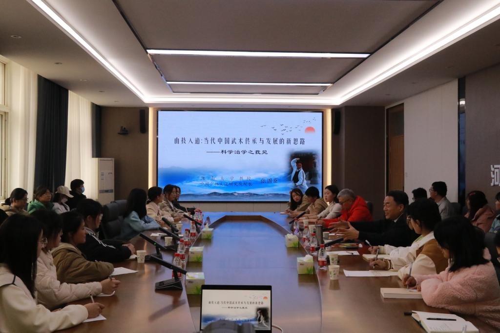 报告会在热烈和谐互动中开始。张国臣博士结合自身治学经历,作了题为《由技入道:当代中国武术文化传承与发展的新思路——科学治学之诀窍》的学术报告,与在场师生交流探讨。