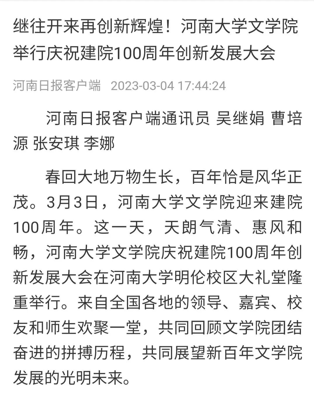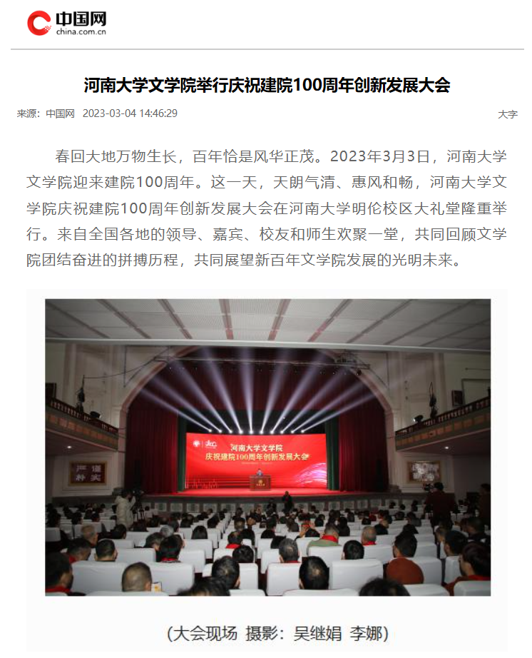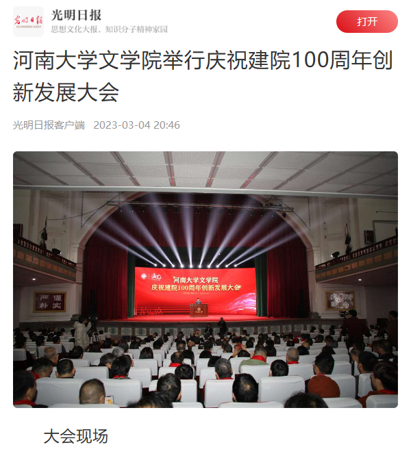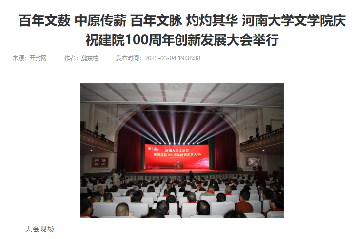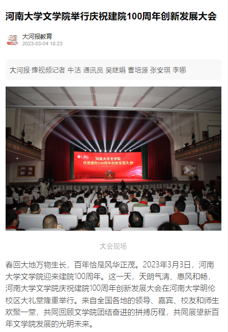 2023年3月3日,太阳集团tyc5997百年院庆当日,太阳集团tyc5997举行了建院100周年创新发展大会,来自社会各界的领导嘉宾,广大校友和师生代表齐聚一堂,国内各高校如中山大学中国语言文学系、华东师范大学中国语言文学系、四川大学文学与新闻学院、郑州大学太阳集团tyc5997、信阳师范学院传媒学院、周口师范学院太阳集团tyc5997、太阳集团tyc5997北京校友会、太阳集团tyc5997山东校友会等单位纷纷发来贺信贺词,祝贺太阳集团tyc5997百年华诞。太阳集团tyc5997院长武新军在大会致辞中展望了学院新百年的发展方向与规划。他表示,学院将以“明德新民,止于至善”的校训为向,在接续优良传统的同时实现创新发展,致力于建立国际一流学科、冲击A类学科,大力发展交叉学科,完善一流成果产出机制,构建有中国特色的学科体系、学术体系、话语体系方面,坚持人才导向,立足创新发展动力,不断凝练新的学科方向,推动学院高质量发展。