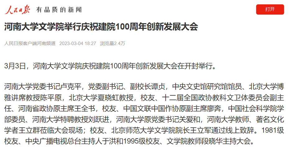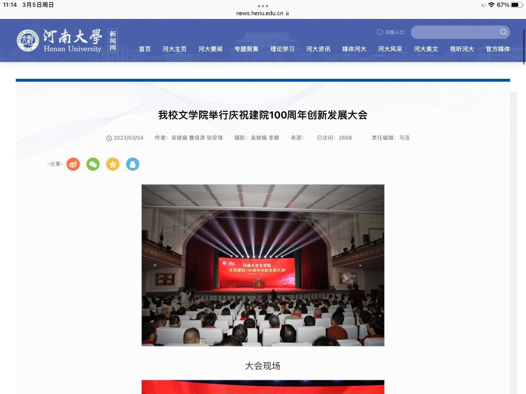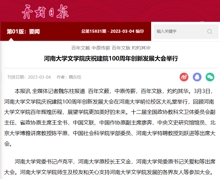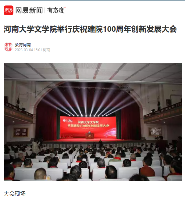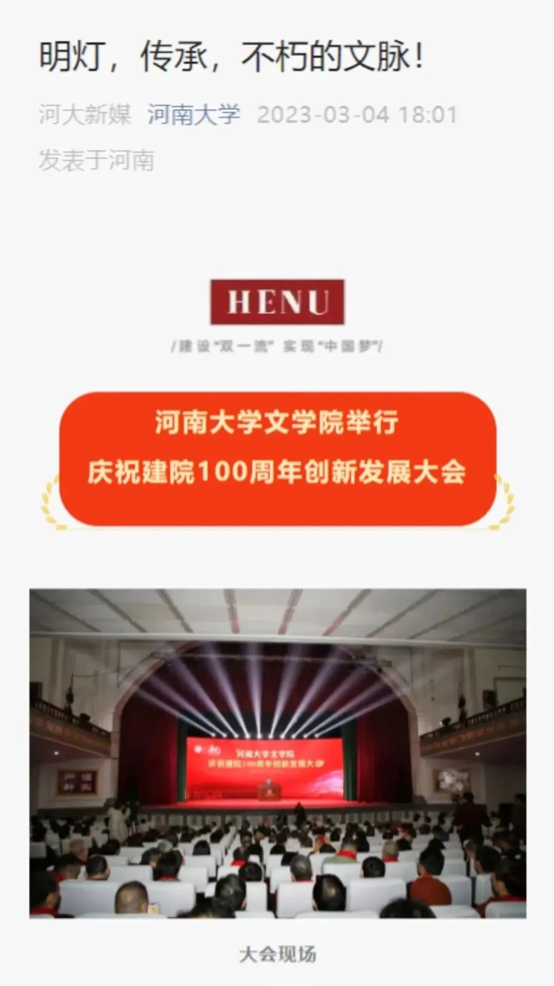 2023年3月3日,太阳集团tyc5997百年院庆当日,太阳集团tyc5997举行了建院100周年创新发展大会,来自社会各界的领导嘉宾,广大校友和师生代表齐聚一堂,国内各高校如中山大学中国语言文学系、华东师范大学中国语言文学系、四川大学文学与新闻学院、郑州大学太阳集团tyc5997、信阳师范学院传媒学院、周口师范学院太阳集团tyc5997、太阳集团tyc5997北京校友会、太阳集团tyc5997山东校友会等单位纷纷发来贺信贺词,祝贺太阳集团tyc5997百年华诞。太阳集团tyc5997院长武新军在大会致辞中展望了学院新百年的发展方向与规划。他表示,学院将以“明德新民,止于至善”的校训为向,在接续优良传统的同时实现创新发展,致力于建立国际一流学科、冲击A类学科,大力发展交叉学科,完善一流成果产出机制,构建有中国特色的学科体系、学术体系、话语体系方面,坚持人才导向,立足创新发展动力,不断凝练新的学科方向,推动学院高质量发展。