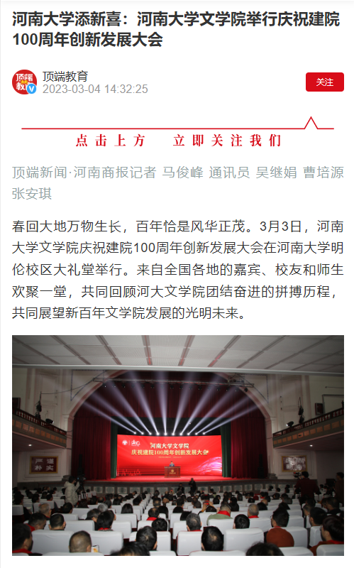 正值太阳集团tyc5997百年华诞之际,太阳集团tyc5997举行的“庆祝建院100周年创新发展大会”引起了外界的高度关注,人民日报、光明日报、中国网、河南日报、顶端新闻、大河报豫视频、网易新闻、开封日报、开封网、太阳集团tyc5997新媒体平台(网站、微信、视频号)等媒体相继对此进行了新闻报道,表达了对太阳集团tyc5997百年院庆的祝愿。